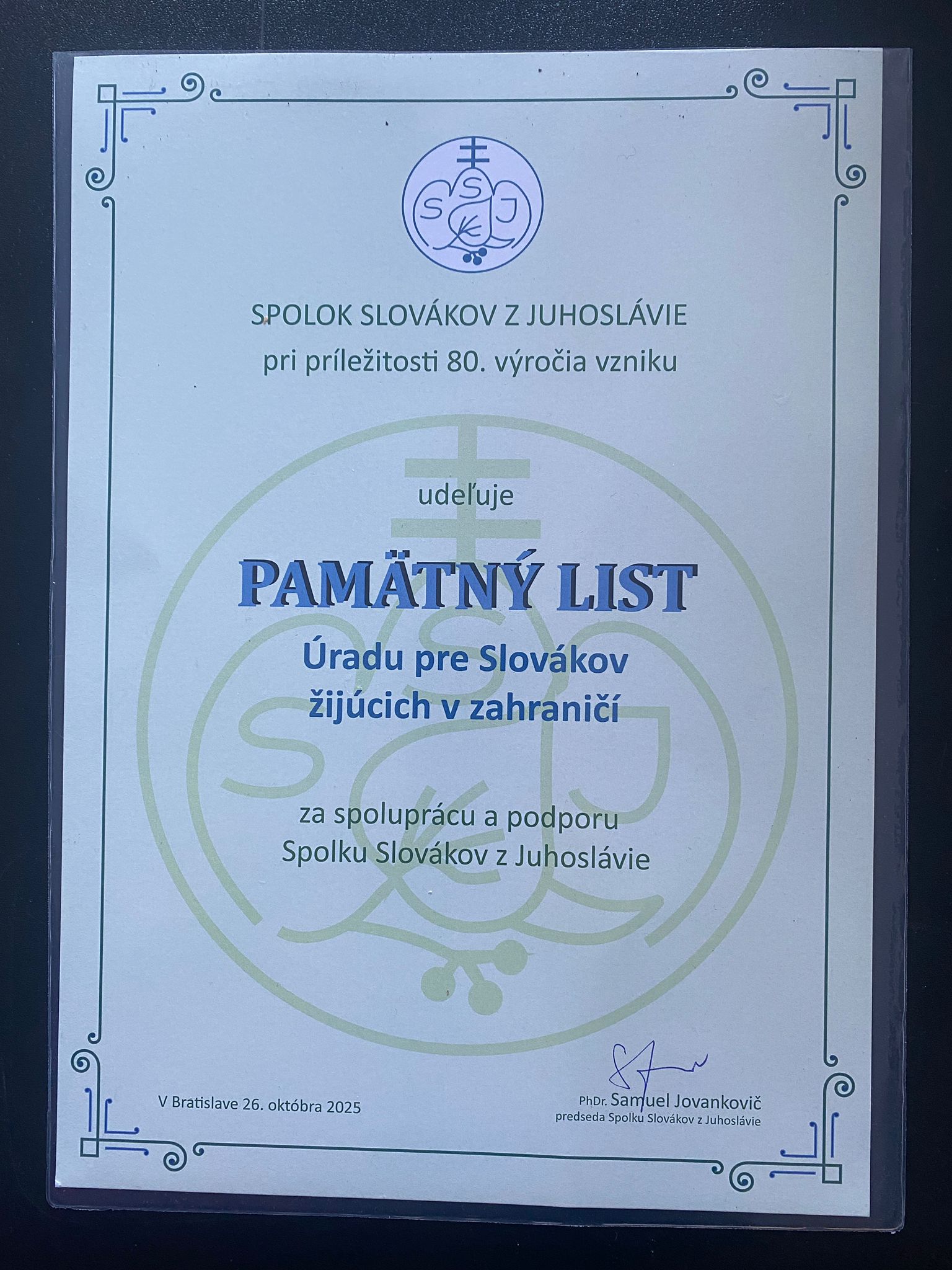 Úrad pre Slovákov žijúcich v zahraničí na podujatí reprezentovala predsedníčka Dagmar Repčeková, ktorá v mene úradu odovzdala Medailu Úradu pre Slovákov žijúcich v zahraničí PhDr. Samuelovi Jovankovičovi, dlhoročnému predsedovi Spolku Slovákov z Juhoslávie, historikovi, publicistovi a významnému predstaviteľovi slovenskej komunity vo Vojvodine. Ocenenie mu bolo udelené za jeho celoživotnú prácu v oblasti kultúrneho a spoločenského života Slovákov z Dolnej zeme, ako aj za vedecký a pedagogický prínos v oblasti histórie a vzdelávania.