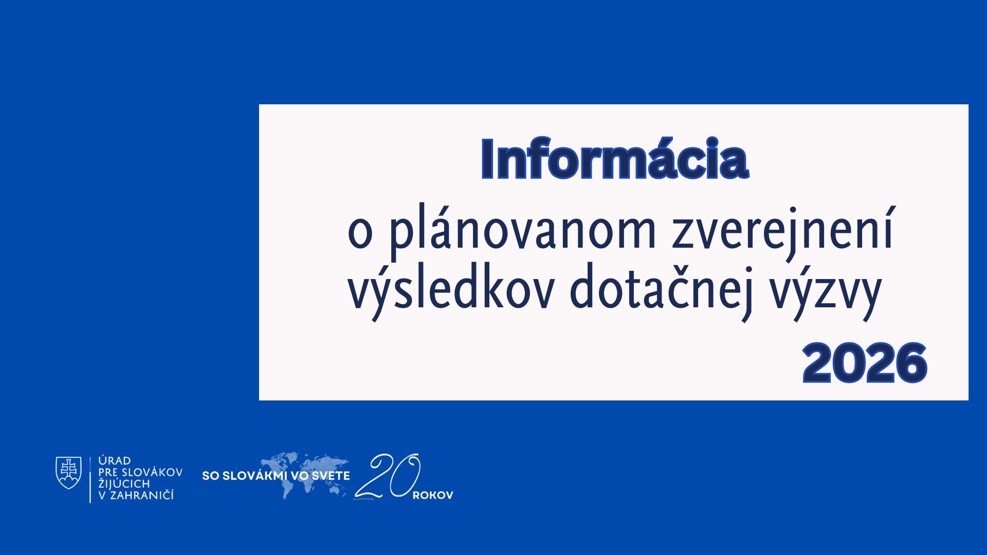 Úrad pre Slovákov žijúcich v zahraničí (ďalej len „ÚSŽZ“) v zmysle § 5 zákona č. 474/2005 Z. z. o Slovákoch žijúcich v zahraničí a o zmene a doplnení niektorých zákonov (ďalej len „zákon“) a platného vnútorného predpisu – Smernica č. 01/2024 z 23. februára 2024 о poskytovaní dotácií v pôsobnosti Úradu pre Slovákov žijúcich v zahraničí a v znení jej neskorších dodatkov (ďalej len „Smernica“) zverejňuje tematickú dotačnú výzvu pod názvom Vybrané podujatia organizované v gescii/v spolupráci s ÚSŽZ v roku 2026 (ďalej len „výzva III“) na predkladanie žiadostí o poskytnutie dotácie na rok 2026 (ďalej len „žiadosti“) v zmysle zákona pre oblasť vzdelávanie, veda a výskum, oblasť kultúra, oblasť informácie a oblasť médiá.